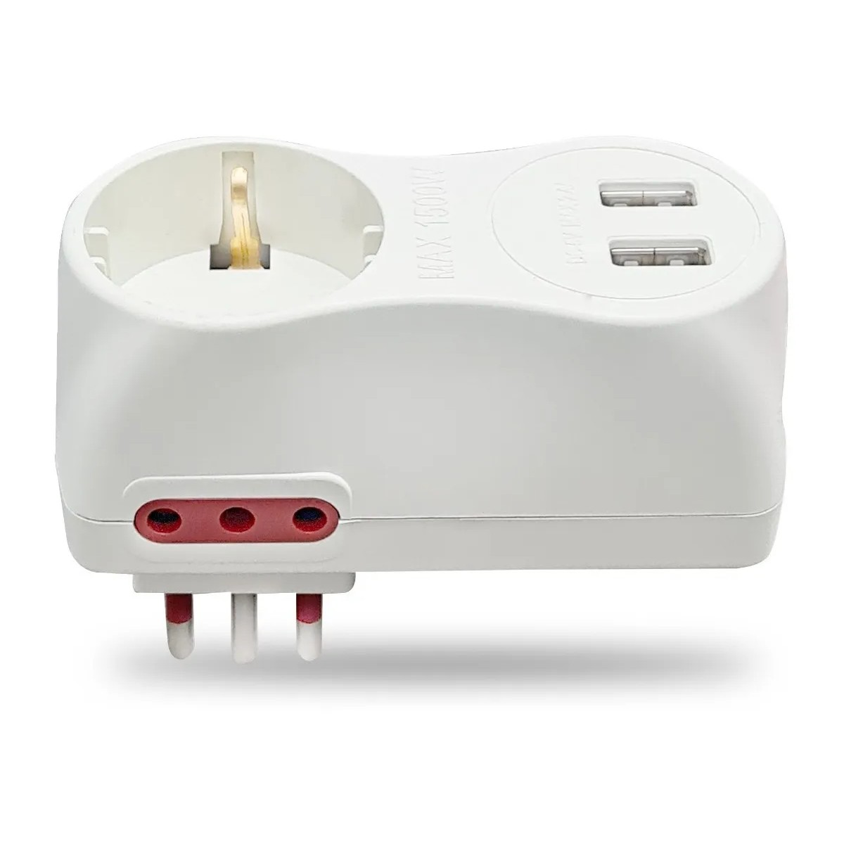 Adaptador 3 en linea a 1 Schuko + 2 Tomas 3 en linea + 2 puertos USB (cargador p/celular)